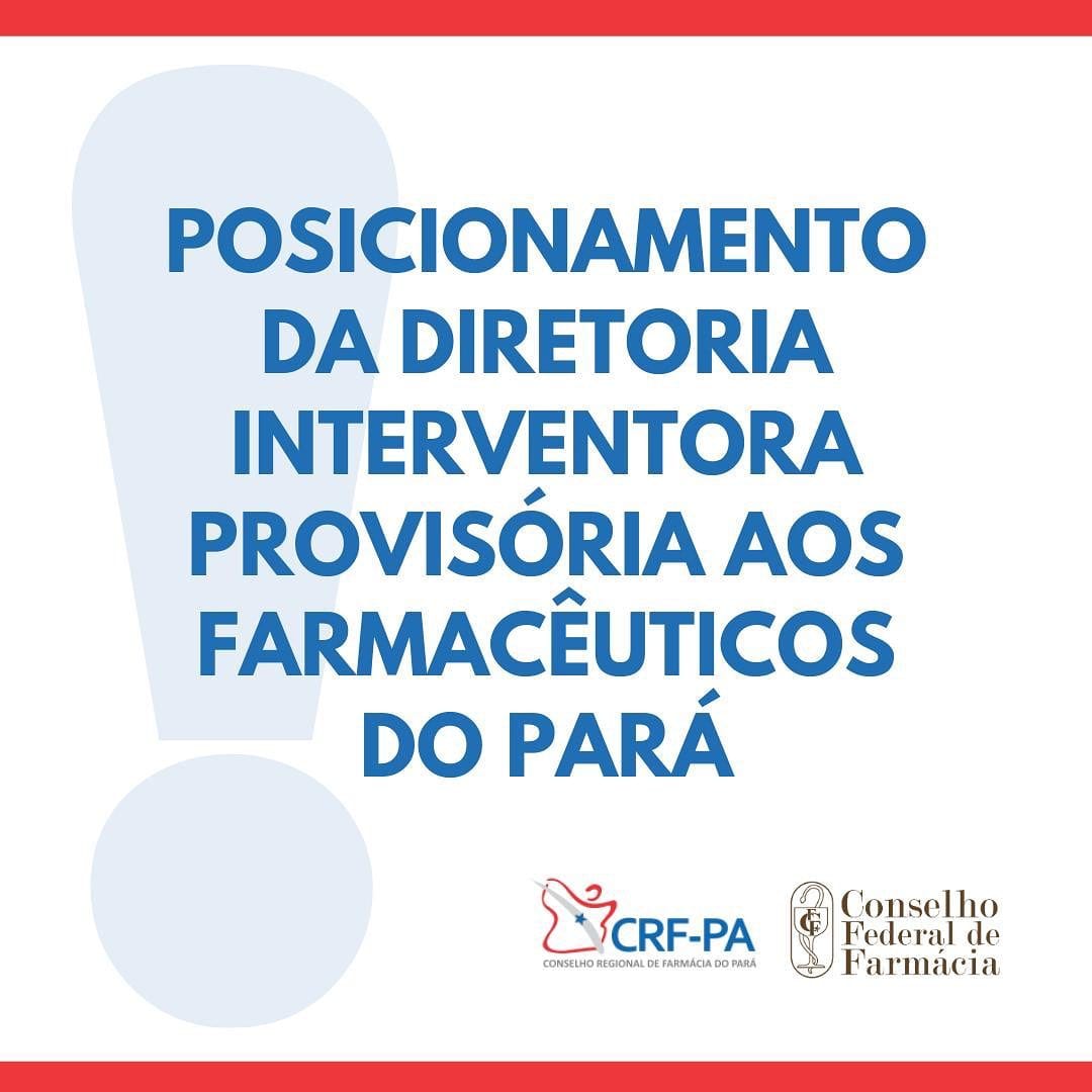 A partir de hoje, 08/01, e por até 90 dias, o CRF-PA estará sob gestão de Diretoria Interventora Provisória nomeada pelo CFF, em caráter cautelar (Resolução/CFF nº 691/2020).