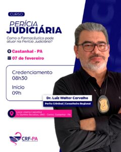 A aula vai ficar por conta do Dr. Luiz Walter Carvalho (Perito criminal e Conselheiro Regional do CRF-PA).